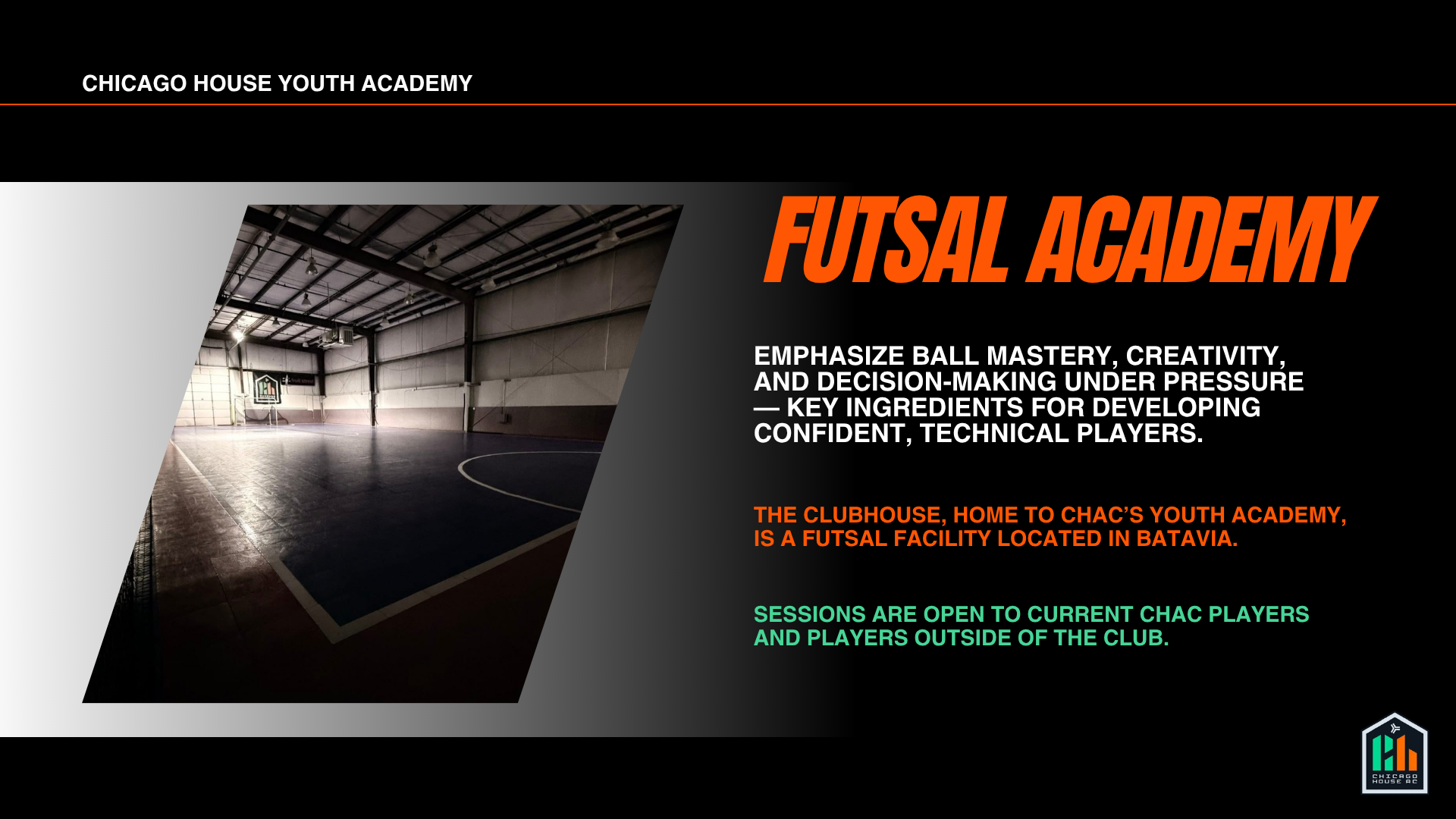 Interested in our dynamic futsal program? Contact us at academy@chicagohouseac.com and let's get you in the game!